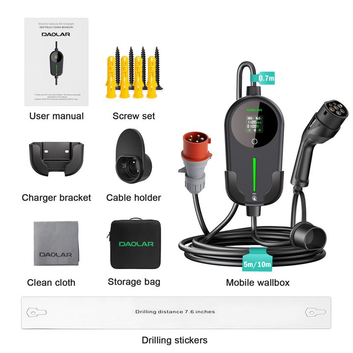 [Vlajková loď] Mobilní nástěnná nabíječka Daolar 11 kW s elektroměrem, 3fázový nabíjecí kabel 6-16A typu 2 s nastavitelným nabíjecím proudem kWh, vodotěsná nabíjecí stanice IP65