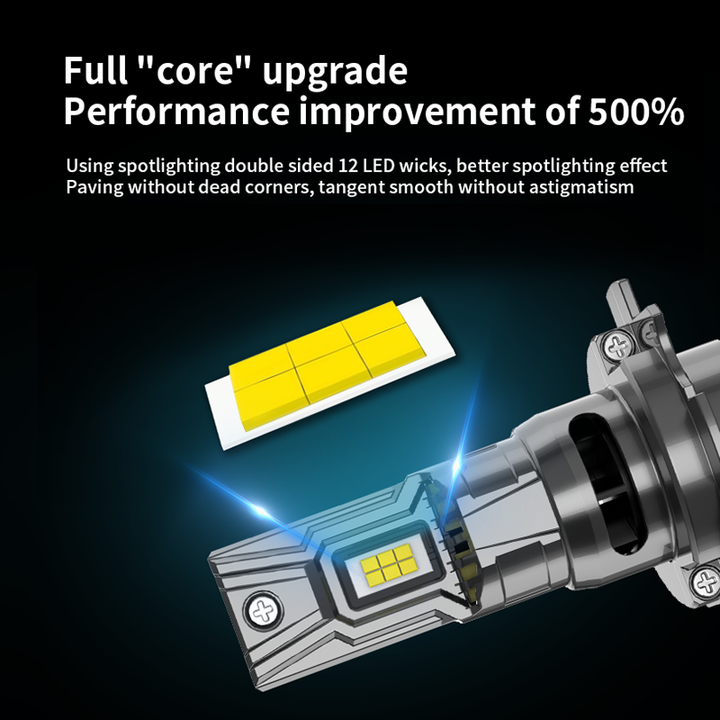 500% Zvýšená jasnost a vynikající noční vidění: Zažijte výrazné zlepšení výkonu díky naší „full-core“ inovaci, která využívá oboustranné 12 LED knoty. To přináší 500% nárůst jasu oproti standardním halogenovým žárovkám, poskytující lepší, koncentrovaný světelný paprsek pro jasnější a bezpečnější jízdu bez mrtvých úhlů či astigmatismu.
