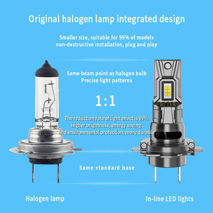 1:1 Halogenový integrovaný design pro snadnou instalaci: Navrženo tak, aby přesně odpovídalo velikosti a standardnímu patici vaší originální halogenové žárovky (poměr 1:1), což zajišťuje nepoškozující, plug-and-play instalaci vhodnou pro přibližně 99 % modelů vozidel. Dosáhněte přesných světelných vzorů a bezproblémové výměny během několika minut.