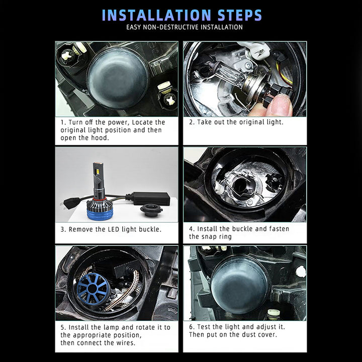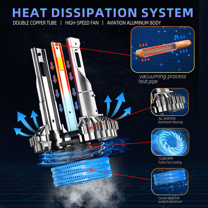 ❄️ Pokročilý systém odvodu tepla pro životnost přes 60 000 hodin: Navrženo s průmyslově vedoucím designem tepelných trubek, dvojitými měděnými trubkami a tělem z leteckého hliníku. Vysokorychlostní, tichý turbo ventilátor o 15 000 ot./min zajišťuje rychlé chlazení, což umožňuje žárovkám spolehlivě fungovat po více než 60 000 hodin a pracovat v extrémních teplotách od -60℃ do +100.
